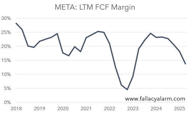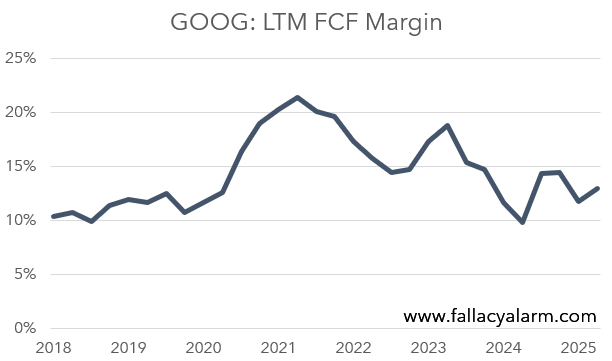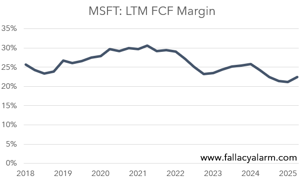 Microsoft’s operating profits are surging as a result. But looking at earnings only tells us how lucrative past investments have been. FCF offers insight into what current investments have to earn to be worth it. On an LTM basis, their FCF margin is currently about 20-25%, significantly lower than where it was before ChatGPT was launched.