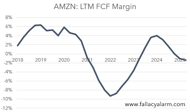 Their weak cash flows are certainly playing a role, too. On an LTM basis, Amazon’s free cash flow margin has dipped back into negative territory as the company is frantically trying to catch up to Microsoft in the AI infrastructure game.