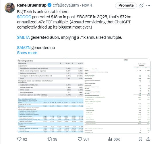 Google is trading at 60x LTM free cash flow. Microsoft is trading at 59x. Meta is trading at 71x. Amazon doesn’t even know what a free cash flow is. The combined market cap of these companies is $11tn, about 16% of the entire US stock market.