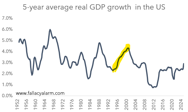 Since World War II, the US has gone through various cycles of acceleration and deceleration of real GDP growth. The 1960s were primarily consumption-driven, particularly from families with baby boomer children. The 1980s were a mix of both as falling interest rates stimulated both consumption and investment.
