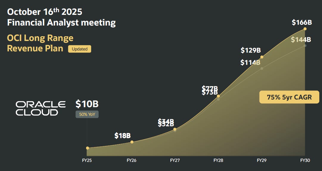 This transforms the company into a massive growth story. Over the last ten years, Oracle has grown their topline by a pitiful 4% annually. Now, they are guiding their cloud business to grow from $10bn in 2025 to $166bn in 2030. That’s about five times (!) their entire ex-cloud business today.