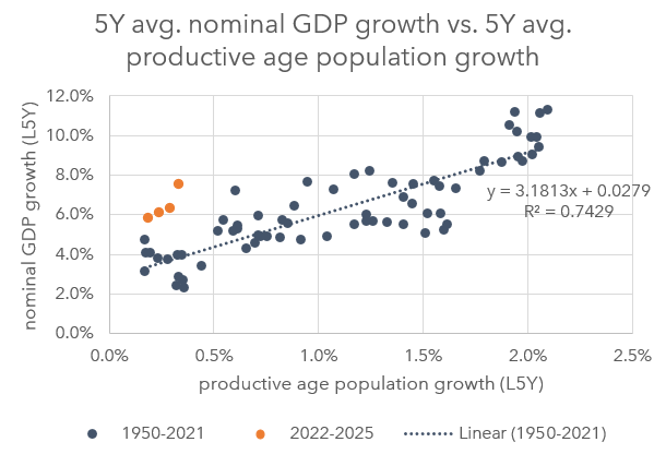 2022 to 2025 have been outlier years. Nominal GDP growth has been more than 2% higher per year than predicted by the historical correlation with productive age population growth. The inflation caused by the surge in fiscal deficit spending is obviously the most plausible explanation.