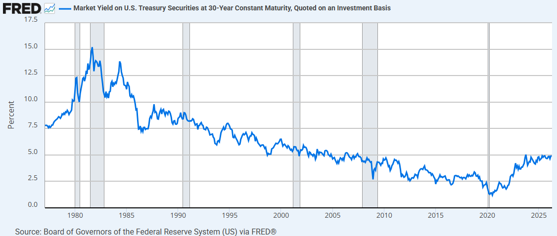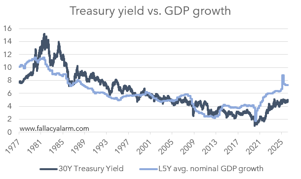 Treasury yields compensate investors for opportunity costs and inflation. The stronger the (expected) returns in risk(ier) assets, the higher the Treasury yield. The higher the expected inflation, the higher the Treasury yield. That’s why the 30Y Treasury yield typically trades close to nominal GDP growth as observed in recent history.