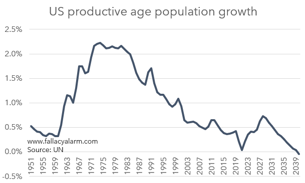 US productive age population growth is expected to accelerate moderately until the early 2030s and will then fall again. The acceleration is a temporary effect as the aftermath of the baby boomer retirement wave. Overall, I see the fair level of the 30Y Treasury yield at 4% maximum in this environment. Unless the US government goes full Argentina of course. But that should boost rents and home prices as well.