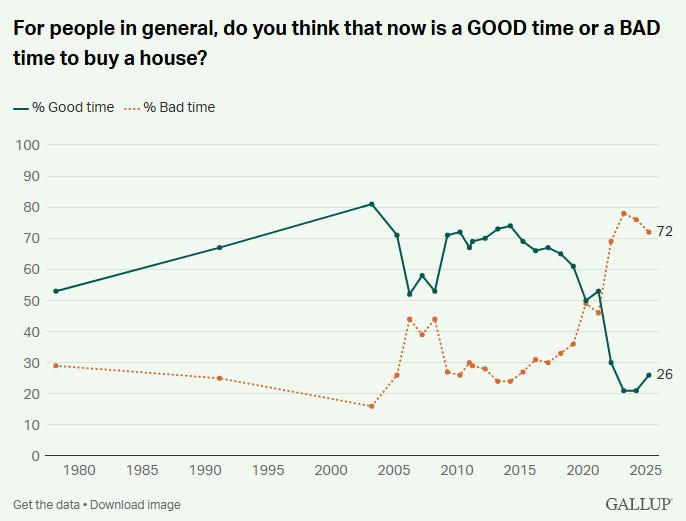 Hard data supports this anecdotal evidence. In a 2025 Gallup survey, only 26% of respondents currently think it’s a good time to buy a house. It’s still close to the lowest level since this survey was started 40 years ago. They will publish the 2026 survey results soon. I’m eager to see those.