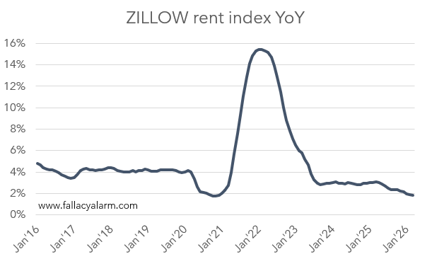 Rent growth is falling. The Zillow Observed Rent Index (ZORI) currently measures LTM rent growth at just 1.8%, significantly below the 4% average observed in the 2010s.