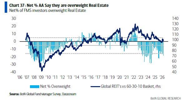 Per the Bank of America Global Fund Manager survey, institutional investors are currently underweight real estate as much as during the aftermath of the GFC 15 years ago.