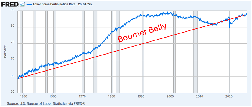 Firstly, labor force participation. The labor force participation of the 25-54Y age group has risen from under 60% in 1950 to almost 85% today. Many women have joined their men at work.